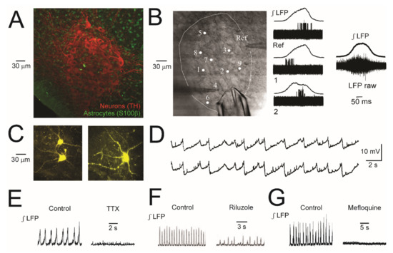 Cell morphology, ‘phase-locked’ spiking and related basic neuronal properties in newborn rat LC slices. (A) Image shows in a chemically fixed slice with double immuno-histochemical staining that the LC is comprised of ~90% densely packed tyroxine-hydroxylase (TH) -positive neurons with a mostly >20 µm soma diameter while smaller cells are glial cells, mostly S100β-positive astrocytes. (B) Traces next to image show overlay of 20 cycles of averaged integrated suction electrode-recorded LFP traces monitored simultaneously with single neuron spiking detected with a ‘cell-attached’ patch electrode. Spiking in a reference neuron (Ref) was continuously monitored with consecutive recording in a further 9 neurons (cells 1 and 2 displayed here). Traces on the right show the averaged integrated LFP and overlaid raw LFP signals from all cycles. Such spike tracking revealed that LC neurons discharge (with a ‘jitter’) during a particular phase of the LFP comprising overlaid spiking of 3–10 neurons. (C) The morphology of neurons filled with lucifer-yellow via the patch electrode during whole-cell Vm recording. (D) Synchronous Vm STOs in 2 simultaneously recorded LC neurons. The smaller and shorter Vm depolarizations may reflect spontaneous postsynaptic potentials (PSPS). (E) LFP rhythm is abolished by bath-application of the voltage-gated Na+ channel blocker tetrodotoxin (TTX, 50 nM) or the connexin-32 gap junction blocker mefloquine (100 μM). (A) adapted with permission from [35]; (B,E–G) adapted with permission from [36]; (C) from [37]; (D) adapted with permission from [32]; Copyright (1989) Society for Neuroscience.