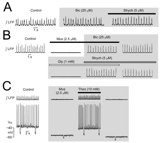 Ongoing synaptic inhibition via GABAAR or GlyR is needed for several types of brain rhythms in adults and newborns (for references, see Section 3 Discussion). In contrast, neonatal LC network rhythm is not affected by blockade of GABAAR or GlyR as exemplified in Figure 6, which also demonstrates that LFP rhythm is abolished by activation of these receptors with muscimol and Gly, respectively [37]. Additionally, this figure shows for muscimol that these receptors mediate a pronounced hyperpolarization and conductance increase. The Vm recording also demonstrates that low millimolar theophylline blocks the GABAAR [58] in the presence of muscimol, leading to both reversal of the hyperpolarization plus conductance increase and recovery of rhythm [37].