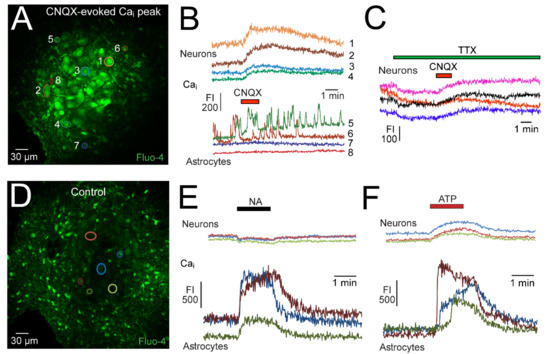 In our study on the functional TARP-AMPAR complex [35], the partial agonist CNQX evokes a modest and uniform Cai rise in neurons with no effect on astrocytes. However, spontaneous Cai rises occur randomly in a subpopulation of ~20% of astrocytes. This is shown in Figure 9 which also exemplifies that the CNQX-evoked neuronal Cai rise persists in TTX which lowers Cai baseline.