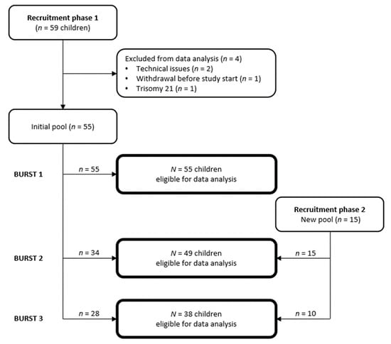 The study protocol of the ambulatory assessment phase was similar for all three bursts, which were administered approximately half a year apart. However, within the project an intervention to enhance self-regulation was conducted before Burst 2. Children were assigned to one of two groups, with the experimental group receiving the full intervention and the control group receiving a reduced intervention. Both groups showed slight improvement in their self-regulation with no significant difference between the groups [].