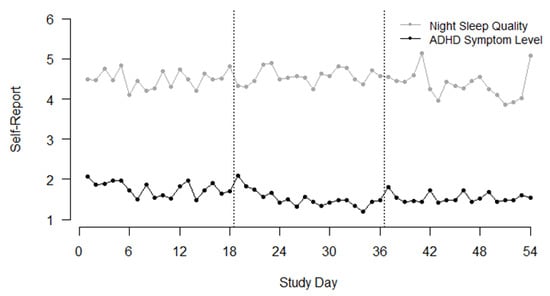Time course of self-reported night sleep quality and ADHD symptom levels (in the afternoon) across all 54 study days; The dashed lines indicate breaks between each burst.
