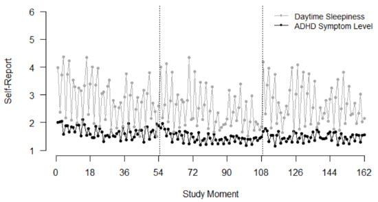Time course of self-reported daytime sleepiness and ADHD symptom levels across all 162 study moments, with three moments per day; The dashed lines indicate breaks between each burst.