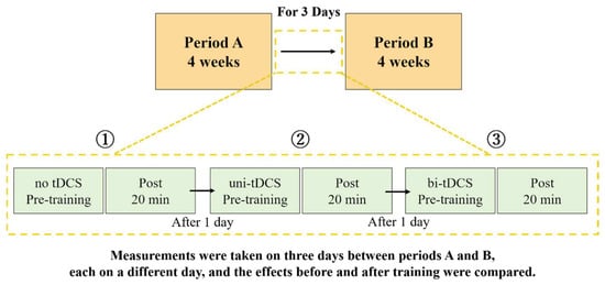 Assisted gait training only (no-tDCS) was conducted in period A, and tDCS over the SMA of the bilateral hemispheres combined with assisted walking training (bi-tDCS) in period B were conducted for 4 weeks each. The immediate effects of the three conditions (1) to (3) on the motor function of the paretic lower limb were measured before and 20 min after training in the period between periods A and B (3 days). Abbreviations: tDCS, transcranial direct current electrical stimulation.