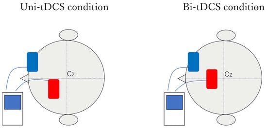 The red electrode in the figure indicates the anode and the blue indicates the cathode. The anode was placed in the SMA of the injured hemisphere (3 cm anterior to the lateral side of Cz) for the uni-tDCS condition and in the SMA of the bilateral hemispheres (3 cm anterior to Cz) for the bi-tDCS condition based on the International Electroencephalogram 10–20 method. The cathode was placed in the supraorbital region. Abbreviations: SMA, supplementary motor area; tDCS, transcranial direct current electrical stimulation.