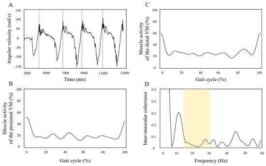 The angular velocity of the anteroposterior tilt of the paretic lower leg during gait is shown in (A). The positive values in the graph indicate the anterior tilt of the lower leg, and the dashed line indicates the time of heel-ground contact. The muscle activities of the VM in the proximal (B) and distal (C) parts during the gait cycle are shown. The 0 percent of the gait cycle is the timing of heel-ground contact on the paretic side. (D) shows the intermuscular coherence of the VM. The yellow box indicates the 15–30 Hz range.