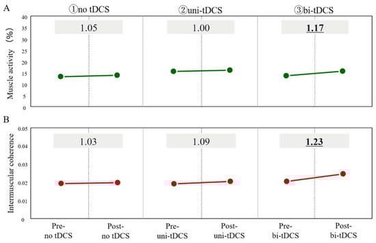 Immediate changes in the muscle activity (A) and intermuscular coherence (B) of the VM due to the different stimulation positions of tDCS are shown. The values in the graphs are the post-training values divided by the pre-training values. Abbreviations: tDCS, transcranial direct current electrical stimulation.