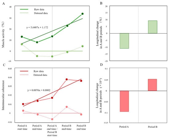 (A,C) shows the muscle activity and intermuscular coherence of the paretic VM at the five time points of periods A and B combined. The dark green and dark red lines show the raw data, and the light green and light red dashed lines indicate the detrended data. (B,D) shows the sum of respective 4-weeks changes in the muscle activity and intermuscular coherence of the paretic VM in periods A and B.