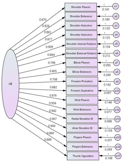 Table 5 presents the data collected for EFA and CFA for UE assessment with the post-stroke patient-customized MMT scoring system. The mean and standard deviation (SD) from Table 5 represent the customized scores for the 41 patients enrolled in the research. In Figure 1, we represent the value loadings of standardized regression weights (resulting from SEM) for the upper extremity. The values of the EFA indices for the UE were: KMO = 0.891, chi-square 946.31, p < 0.001, 136 df, 1 factor with a 13.065 eigenvalue explaining 76.85% of the variance. The results from EFA suggested that the model fit for CFA may be appropriate for unidimensionality, and the results from CFA confirmed this. The CFA indices for model fit were CMIN = 7.589, 119 degrees of freedom, RMR = 0.036, GFI = 0.996, AGFI = 0.994, NFI = 0.995, RFI = 0.994, PRATIO = 0.875, and PNFI = 0.871, suggesting that the model had a good fit to the SEM regression analysis.