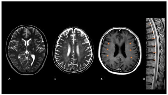 Brain magnetic resonance imaging (MRI) revealed that 76 out of 86 patients (88%) had abnormal hyperintensity lesions on T2-weighted and fluid-attenuated inversion recovery (FLAIR) images. The hyperintensity lesions were in white matter (49/84 (58%)), the basal ganglia (36/84 (43%)), and cerebellum (5/84 (6%)). When we conducted gadolinium-enhanced brain MRI, 53 out of 78 patients (68%) had abnormal enhancement lesions. Forty-two out of 78 patients (54%) had LPRGE patterns in the cerebral white matter. Twenty-nine out of 71 patients (41%) who underwent spinal cord MRI showed intramedullary hyperintensity lesions on T2-weighted images. Twenty-four out of 51 patients (47%) who underwent enhanced spinal cord MRI had abnormal enhancement lesions. These were intramedullary lesions (12/51 (24%)) and meningeal lesions (13/51 (25%)). Images of brain and spinal cord MRI of representative patients are shown in Figure 1.
