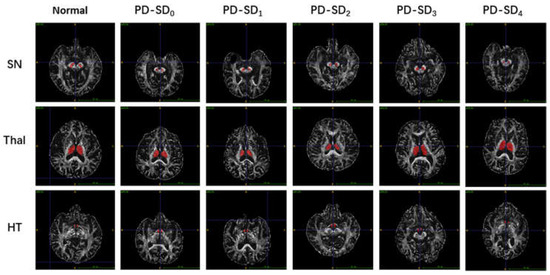 T1-weighted three-dimensional (3D-T1), T2-weighted, T2-weighted FLAIR, DWI and DTI were performed. DTI measures of the FA value provided information on the brain’s microstructural integrity. The details of the MRI acquisitions are as follows: T2-weighted repetition time (TR) = 4000 ms, echo time (TE) = 111.2 ms, flip angle = 142°, field of view (FOV) = 230 mm × 230 mm, matrix = 436 × 295, gap = 0.4 mm, slice thickness = 5.0 mm and basic slices = 25. The sequence parameters of the DTI were substituted as follows: TR = 13,700 ms, TE = 114 ms, flip angle = 90°, diffusion-weighted images with b-value of 1000 s/mm2, 64 orientations in diffusion gradients, FOV = 224 mm × 224 mm, matrix = 112 × 112, slice thickness = 2 mm, gap = 0 m and basic slices = 58. The DTI data were preprocessed using FSL (FMRIB’s Software Library, Oxford, UK) [23] (www.jiscmail.ac.uk/lists/fsl.html, accessed on 1 October 2020). ROIs were drawn manually on each FA map according to B0 images in the DTI space. Each substantia nigra (SN), thalamus (Thal) and hypothalamus (HT) region of the ROIs was manually segmented on all the participants’ imaging using the ITK-snap software [24] (www.itksnap.org, accessed on 1 January 2020) by a neuroimaging physician who was blinded to the clinical information of the participants. After drawing the ROI, the software calculated the average FA within the ROIs. Figure 1 shows how the ROIs in the substantia nigra (SN), thalamus (Thal) and hypothalamus (HT) were drawn for all the enrolled subjects.