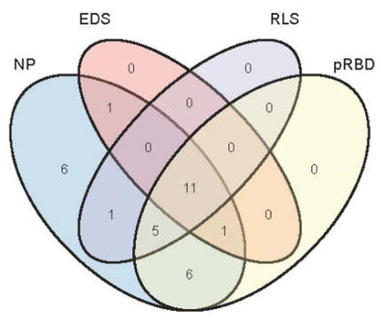 Prevalence and overlap of sleep disorders in patients with early PD. NP, nighttime problems; EDS, excessive daytime sleepiness; RLS, restless leg syndrome; pRBD, probable REM sleep behavior disorder.