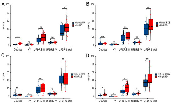 Clinical features of early PD patients with various sleep disorders (A–D). Comparing the courses—HY, UPDRS III, UPDRS IV and UPDRS—the totals are illustrated for early PD patients with NP (A), EDS (B), RLS (C) or pRBD (D) and those without. NP, nighttime problems; EDS, excessive daytime sleepiness; RLS, restless leg syndrome; pRBD, probable REM sleep behavior disorder; ns, no significance; * p < 0.05, ** p < 0.01.
