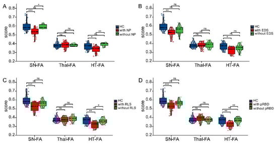 Imaging features of early PD patients with various SDs and healthy controls (A–D). The differences in FA values for SN, Thal and HT among healthy controls, early PD patients with NP (A), EDS (B), RLS (C) or pRBD (D) and those patients without. NP, nighttime problems; EDS, excessive daytime sleepiness; RLS, restless leg syndrome; pRBD, probable REM sleep behavior disorder; ns, no significance; * p < 0.05, ** p < 0.01, *** p < 0.001.