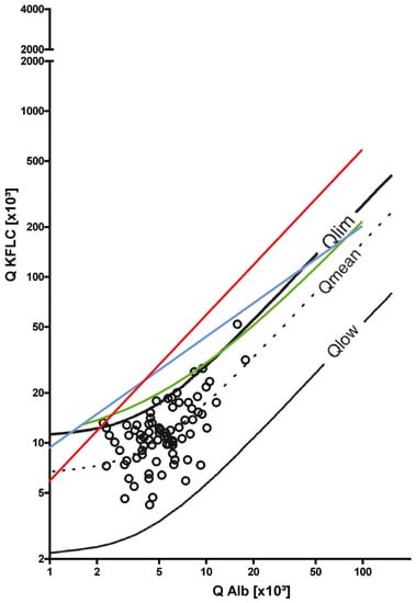 - Reiber, H.; Zeman, D.; Kušnierová, P.; Mundwiler, E.; Bernasconi, L. Diagnostic relevance of free light chains in cerebrospinal fluid—The hyperbolic reference range for reliable data interpretation in quotient diagrams. Clin. Chim. Acta 2019, 497, 153–162. [Google Scholar] [CrossRef]