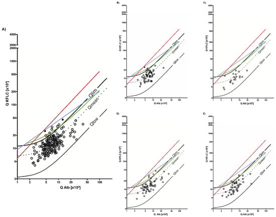Since its publication in 2019, the Reiber’s diagram for KFLC has gained wide acceptance due to its consideration of the physiology of CSF flow and diffusion laws, leading several authors to recommend its use [4,5,6,15,21,22,23,24]. Our previous publications have again demonstrated the superior diagnostic sensitivity of the Reiber’s diagram in assessing intrathecal IgG synthesis in MS patients compared to alternative approaches (KFLC index, Senel’s linear function, Presslauer’s exponential function) [4,5,7,8,14,15].