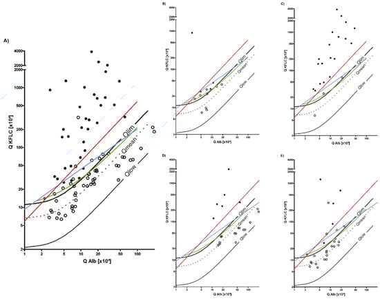 Oligoclonal bands and synthesis of kappa-free light chain (KFLC) in patients suffering from inflammatory neurological diseases. The black lines represent Reiber’s diagram for KFLC, the blue lines Presslauer’s KFLC exponential curve, the green lines Senel’s linear function, and the red lines the linear KFLC index of 5.9. The filled black dots represent patients with pathological oligoclonal band results, while black circles represent oligoclonal band negative patients. Dots above the threshold lines represent positive patients for the used method. Depicted are all patients suffering from inflammatory neurological diseases other than MS (A). Furthermore, oligoclonal band and KFLC results are shown for different disease entities (autoimmune-mediated encephalitis and vasculitis with affection of the central nervous system (CNS) (B), CNS infections with spirochetes (neuroborreliosis and neurosyphilis) (C), bacterial meningitis (D), and viral encephalitis (E)). QKFLC = KFLC quotient (KFLC in cerebrospinal fluid [mg/L]/KFLC in serum [mg/L]) and Q Alb = albumin quotient (albumin in cerebrospinal fluid [mg/L]/albumin in serum [g/L]).