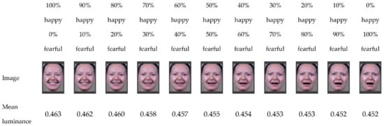 Continuum between 100% happy and 100% fearful facial expressions in 10% increments. Mean luminance (from 0.000 to 1.000) for each image was obtained using GIMP version 2.10.12 [33].