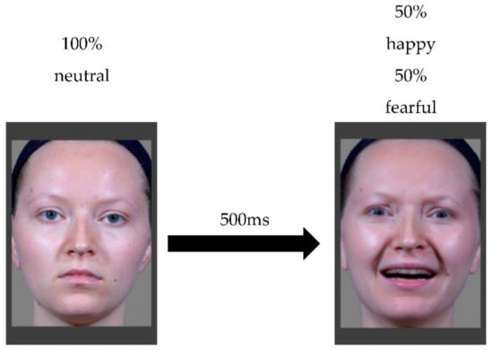 In order to make the presentation of the morphed expressions more natural and dynamic, animations from our series of still morphs were generated, once again using FantaMorph 5 [31]. The animations depicted a continuous formation of each morphed face as well as the 100% happy face over the course of 500 ms (15 frames) from a neutral facial expression (for an example, see Figure 2).