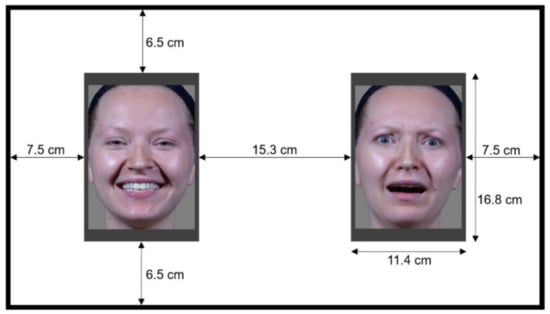 When appearing on the presentation screen, each stimulus had a height of 16.8 cm and a width of 11.4 cm with a resolution of 412 × 604 pixels (see Figure 3).