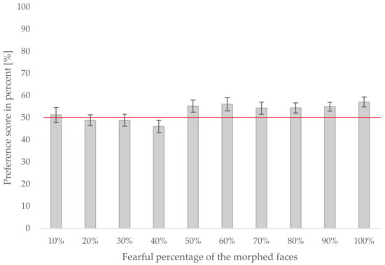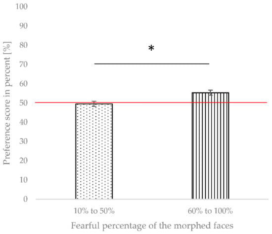 Thus, as depicted in Figure 5, we found that from morph level 60% onward, all infants showed a significant looking preference for fearful morphs compared to a happy face.