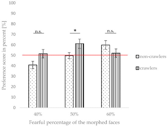 The preference scores for 40%, 50%, and 60% fearful morph levels for crawling and non-crawling infants. Error bars indicate the standard error of the mean. * indicates a p-value < 0.05, and n.s. (non-significant) indicates p-values > 0.05.