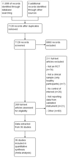 For an overview of the study selection process see Figure 1. Systematic searches were conducted on 22 June 2020 with a final update search conducted on 30 November 2021. Searches yielded 11,898 records. Duplicates were removed, followed by screening for inclusion based on title and abstract. For the remaining records full texts were retrieved and assessed for inclusion. Data from 36 records were included in the review and all 36 were included in meta-analyses.