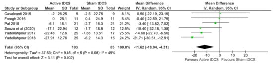 Meta-analyses were conducted for each of the primary outcomes-tinnitus, depression, and anxiety. Random effects models were used, due to the heterogeneity encountered. A statistically significant effect favouring active tDCS over sham was observed for tinnitus (MD −11.62, 95% CI −18.94, −4.31), moderate certainty (Table 2), heterogeneity: Tau2 = 37.53; Chi2 = 9.95, df 5 (p = 0.08); I2 = 49% (Figure 3).