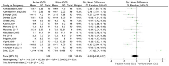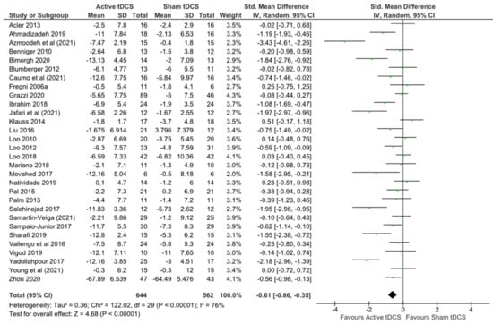 A statistically significant effect favouring active tDCS over sham was also observed for depression (SMD −0.61, 95% CI −0.86, −0.35), low certainty (Table 3) heterogeneity: Tau2 = 0.36; Chi2 = 122.02, df 29 (p = 0.00001); I2 = 76% (Figure 4).