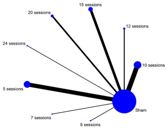 The quantity of the data on tinnitus symptom severity was too limited for network meta-analysis. As a result, no disentanglement by tDCS parameters took place. The data extracted for depression were sufficient in quantity to allow for further analysis by three stimulation parameters: electrode montage, duration of stimulation session, and number of sessions (Figure 6, Figure 7 and Figure 8). Since nearly all included studies used the same current intensity, no network meta-analysis was conducted for this parameter. The network meta-analyses provided a ranked list of parameters in each category, with the estimated probability that each setting for that parameter is the best and Monte Carlo standard error estimations (Table 2, Table 3 and Table 4).