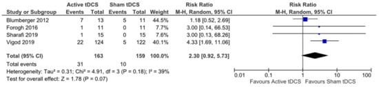 Data from secondary outcomes—adverse effects, quality of life, and neurophysiological change were also extracted if reported in the included studies. Those studies that included a measure of quality of life did not measure and/or report their results for this outcome in a way that allowed for meta-analysis. Adverse effect data were summarised as risk ratios (Figure 9). There was no statistically significant difference in the number of adverse effects following active tDCS compared to sham (RR 2.30, 95% CI 0.92, 5.73).