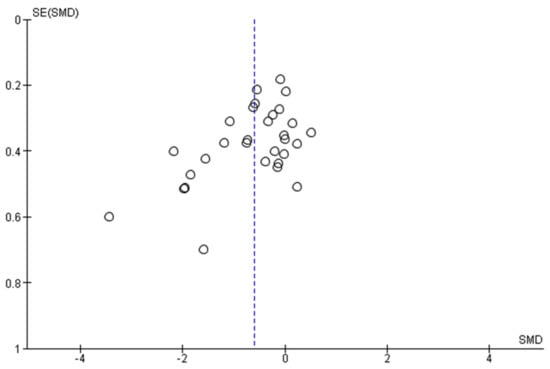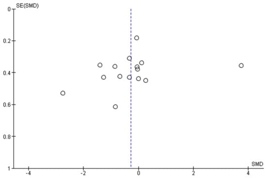 No statistically significant effect was observed for anxiety (SMD −0.14, 95% CI −0.31, 0.04), very low certainty (Table 4) heterogeneity: Tau2 = 1.48; Chi2 = 172.80, df 14 (p < 0.00001); I2 = 95% (Figure 5).