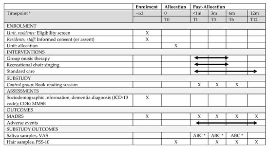 Schedule of enrolment, interventions, and assessments of the exploratory substudy within the MIDDEL-project. † T0: Before the music sessions start; T1: Within 1 month after the music interventions started or within 1 month after completion of the baseline assessment in the control group; T3: 3 months after the start of the music sessions; T6: 6 months after the start of the music sessions; T12: 12 months after the start of the music sessions. * A. Ten minutes before session; B. Fifteen minutes after session; C. Sixty minutes after session.