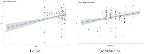 In addition to the main analysis above, we conducted an additional multiple regression to explore the extent to which the current set of predictors are related to metalinguistic awareness. As mentioned above, it is possible that metalinguistic awareness performance is influenced by one’s sociolinguistic experience, especially when multiple languages are learned in childhood. For this reason, the same regression described above was conducted again, this time with metalinguistic awareness as the predictor. The results of this second analysis revealed that average L2 use and languages spoken across the ego’s lifespan were the only significant predictors of metalinguistic awareness (mean L2 use: B = −0.067, SE = 0.022, β = −2.94, p = 0.004; languages lifespan: B = −0.144, SE = 0.043, β = −3.35, p < 0.001). These findings could indicate that in healthy young adults, metalinguistic awareness is more influenced by current use of the language and less by exposure to language earlier in life. This interpretation would be in line with the definition of metalinguistic awareness (i.e., the ability to manipulate and transform language efficiently [93]). This finding could also indicate that, in adults, metalinguistic awareness might be a proxy of the participant’s bilingual skills in the present, but might not reflect the extent to which their metalinguistic experience in childhood modulates ToM. This finding should be further explored in future research.