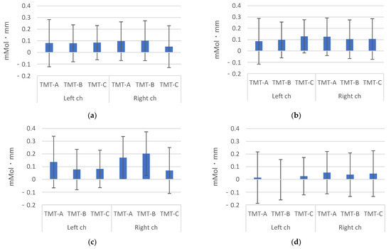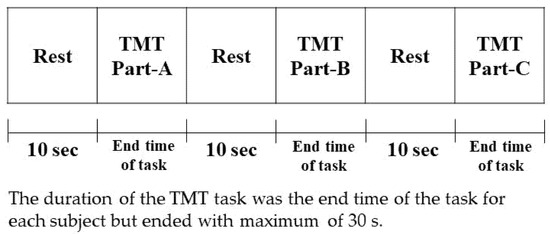 Two types of TMTs are currently used as functional tests: parts A and B. Part B not only measures a more difficult cognitive task but also places greater demands on motor speed and visual search, which are known to result in lower performance compared with part A [22]. In the present study, the time required to complete a task in part B is longer than that in part A, which is similar to previous findings. In the present experiment, all subjects performed part A first, followed by part B and then part C. In part C, the difficulty of the task was further increased by the use of alphabets in addition to numbers and hiragana, which may have reduced the performance. Because the raw NIRS data are relative, they cannot be directly compared among subjects or channels [23,24]. Therefore, performing a comparison by each channel or number of measurements is not possible. However, the comparison for each TMT showed lower values for the TMT-C and higher values for the TMT-A and TMT-B. When the task is too easy or difficult, no increase has been reported in cerebral blood flow. The TMT-C was a difficult task, which may have resulted in lower values.