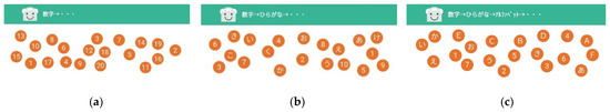 TMT of tablet manufactured by NeU using in the study. (a) TMT-A, (b) TMT-B, (c) TMT-C. TMT-A is task to draw a line connect numbers. The TMT-B, which includes a task to connect numbers and letters of Japanese (hiragana), and TMT-C, which includes a task to connect numbers, hiragana, and alphabets in order, were also conducted.