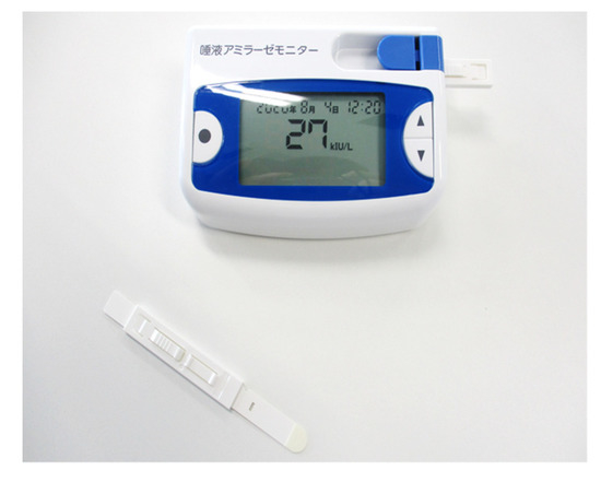 A salivary amylase monitor manufactured by Nipro Corporation (Osaka, Japan) was used to evaluate stress (Figure 5). This device consisting of the main unit and a chip, is designed to collect saliva and measure amylase contained in saliva.