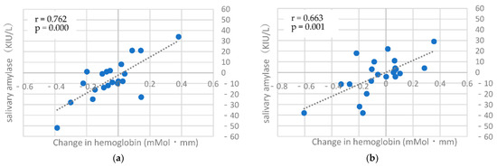 Correlation diagram of the difference in hemoglobin concentration change (TMT-C Left) and the difference in amylase value. (a) The second and third measurements fluctuations, (b) The third and fourth measurements fluctuations.