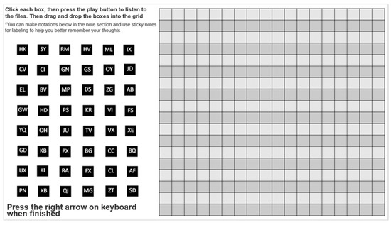 The trimmed speech samples were each linked to 48 identical solid gray squares with randomly assigned two-letter identifiers for better retention during the experiment (as in [6]). All speaker stimuli were embedded in a single PowerPoint slide next to a 17 × 18 grid (Figure 1). The slide with embedded speaker stimuli was presented to each listener with instructions.