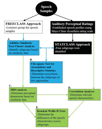 A flowchart depicting the summary of study design procedures. Black boxes indicate data and processes that have been previously collected and completed in Diehl et al., 2019 [10]. Blue boxes indicate methods conducted to determine the overlap between the two group approaches. Finally, green boxes indicate study procedures to determine contributing speech characteristics for the findings of the FREECLASS approach. Please note that the same perceptual speech profiles based on the Mayo Clinic dysarthria rating scale were used in both approaches. (A) Additive similarity tree cluster analysis; (B) chi-square test for associations and descriptive statistics; (C) multidimensional scaling (MDS) analysis; (D) correlation analyses; (E) Kruskal–Wallis H tests.