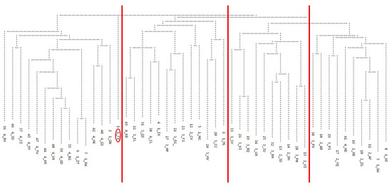 A dendrogram depicting the results of an additive similarity tree cluster analysis. The red lines indicate the boundaries made in defining the identified subgroups of the study. Participant FX, circled in red, did not belong to any of the identified four groups and was excluded from the analyses.