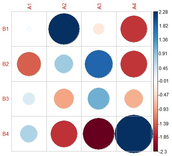 A correlation plot describing the results of the chi-square test for associations. The blue circles indicate the degree of positive associations between the subgroups of the FREECLASS approach and the subgroups of the STATCLUSTER approach. The red circles indicate the degree of negative associations.