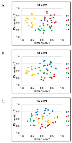 Perceptual similarity data plotted in the common spaces based on the dimensions revealed from MDS analysis. (A) A perceptual space defined by Dimension 1 (D1) and Dimension 2 (D2); (B) a perceptual space defined by D1 and Dimension 3 (D3); (C) a perceptual space defined by D2 and D3.