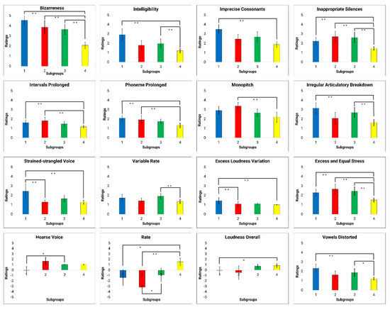 As shown in Table 3, Kruskal–Wallis H tests revealed significant between-group effects across the identified subgroups from the FREECLASS approach for all of the perceptual speech characteristics that were at least moderately correlated (r > 0.4) with D1 (p < 0.05), except for alternating loudness (p = 0.07). Table 4 and Figure 6 display the subsequent results of Dunn’s post-hoc test (adjusted p-values according to Bonferroni corrections) for all variables with significant Kruskal–Wallis H test results, and moderately correlated with D1. To start with, subgroup 4 had significantly lower ratings of bizarreness, excess and equal stress, and inappropriate silences relative to the ratings of all other subgroups (p < 0.03). Subgroup 4 also had significantly lower ratings of intervals prolonged and phonemes prolonged relative to subgroups 1 and 2 (p < 0.05). In addition, between-group comparisons for the ratings of intelligibility and irregular articulatory breakdown showed that subgroup 4 had significantly lower ratings than subgroups 1 and 3 (p < 0.04). Finally, subgroup 4 had significantly lower ratings of perceived speech rate and monopitch than subgroup 2 (p < 0.01), and had significantly lower ratings of imprecise consonants, vowels distorted, and excess loudness variation than subgroup 1 (p < 0.01). Interestingly, subgroup 2 also had significantly lower ratings of excess loudness variation than subgroup 1 (p < 0.01).