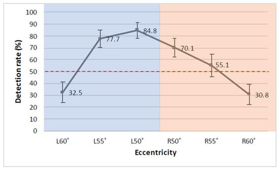 Results revealed that detection rates were mostly explained by target eccentricity, with detection rates dropping at high eccentricities, particularly at 60°. Targets appearing at 50° and 55° both led to good detection performances that did not significantly differ from each other, with targets appearing at 55° (M = 66.10, SE = 6.47) expected to have a 0.59 unit decrease in log odds of detection compared to 50° (M = 77.80, SE = 5.40, 95% CI = −1.35, 0.18). Performances significantly dropped at 60° (M = 31.80, SE = 6.38), with a 2.01 unit decrease in log odds of detection compared to targets appearing at 50° (95% CI = −2.81, −1.22). In addition, Side had a partial role in explaining the detection rates results. Overall, better detection rates were obtained for targets appearing on the left side. In fact, targets appearing on the right side (M = 51.40, SE = 6.00) were expected to have a 0.66 unit decrease in log odds of detection compared to targets appearing on the left side (M = 67.10, SE = 5.75, 95% CI = −1.29, −0.03; Figure 2).