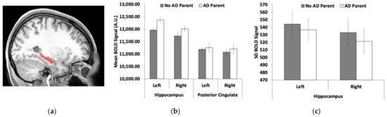 Functional magnetic resonance imaging (fMRI) measures of left and right hippocampi: (a) the hippocampal region of interest (ROI); (b) the mean blood-oxygen-level-dependent (BOLD) signal was greater for young adults who had a parent with Alzheimer’s disease/dementia (AD) than those without AD in the left hippocampus with the same trends, albeit non-significant, in the right hippocampus; (c) no significant effects for the standard deviation of the BOLD signal between the two groups. Brain images represent regions of interest overlaid on a representative younger adult brain normalized to Montreal Neurological Institute (MNI) space. Error bars represent the standard error of the mean (SEM).