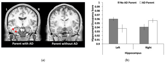 Hippocampal volume differences in young adults with and without a parent with ADRD: (a) a representative sample of hippocampal volume differences between the two groups with the left anatomical brain image showing a young adult with a parent with AD that has an enlarged inferior lateral ventricle and smaller hippocampus than the young adult on the right; (b) a bar graph showing that young adults with a parent with Alzheimer’s disease/dementia (AD) had smaller hippocampal occupancy scores [hippocampal volume/(hippocampal volume + inferior lateral ventricle)] than young adults with a parent without AD. No differences were found for the right hippocampus. Error bars represent the standard error of the mean (SEM). ILV = inferior lateral ventricle; HC = hippocampus; L = left; R = right.