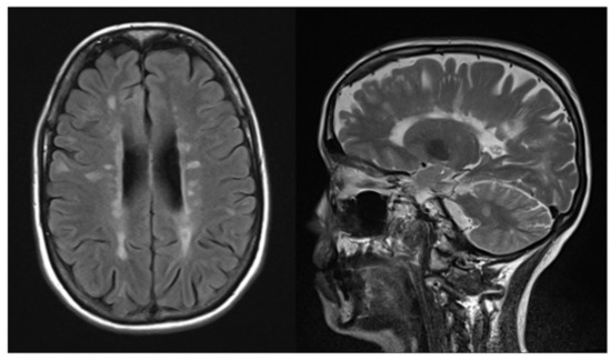 MRI scans showing high load of MS lesions one year prior to GBM diagnosis (left: axial FLAIR, right: sagittal T2w).