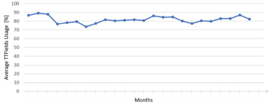 Subsequent to the resection, the patient received radiotherapy (60.0 Gy) with concomitant daily TMZ chemotherapy. Chemotherapy had to be stopped after 5 weeks due to haematotoxicity with thrombocytopenia and was restarted after a break of 4 weeks after completion of radiotherapy with a reduced dose of 150 mg/m² body surface area together with the initiation of TTFields therapy. Chemotherapy was terminated after 11 cycles, while TTFields therapy was continued for another 8 months as monotherapy. During approximately 2 years of stable tumor disease following primary GBM resection, the patient showed an average TTFields usage of over 80%, clearly beyond the suggested threshold of 75% (Figure 3). MS therapy with fingolimod was ceased at the time of GBM diagnosis; although no specific MS therapy was administered since then, no clinical bouts occurred and no new MS lesions could be detected in MRI. However, the general clinical status of the patient slightly deteriorated causing decreased functional status due to the pre-existing neurological deficits.
