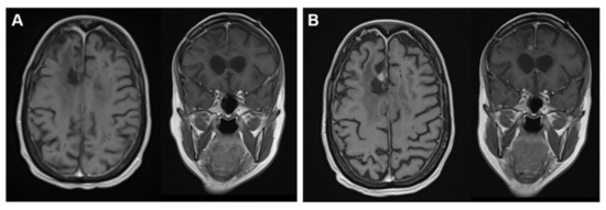 The 52-year-old patient with relapsing-remitting multiple sclerosis (RR-MS) and a Karnofsky performance status of 70% presented with progressive gait disturbance and a declining general condition. Associated to the MS condition, a spastic paraparesis and left-sided limb ataxia was present. Moreover, the patient experienced worsening headaches leading to vomiting in one event, which at this point was attributed to an MS relapse and treated with intrathecal administration of glucocorticoids. Since the patient’s condition did not improve upon treatment, an MS unrelated intracranial space-occupying lesion was considered. Magnetic resonance imaging (MRI) revealed a space-occupying lesion in the right hemisphere with contrast-enhanced margin spreading from fronto-parietal to precentral cortex and septum pellucidum, approximately 4.8 × 4.4 × 3.8 cm3 (Figure 2).