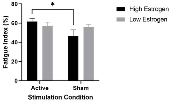 Fatigue index (FI) of the right extensors, stratified by tDCS condition and estrogen level. Data are mean ± SEM. * represents a significant increase (p = 0.04) in the active stimulation vs. the sham condition when estrogen was high.